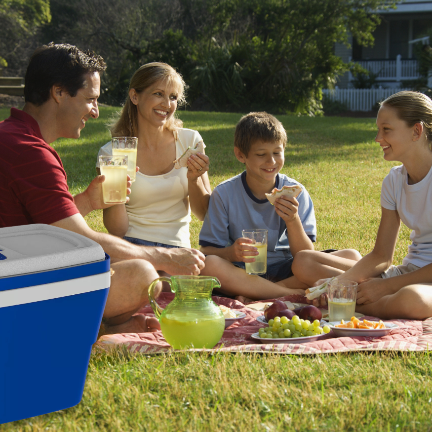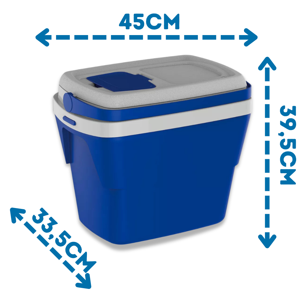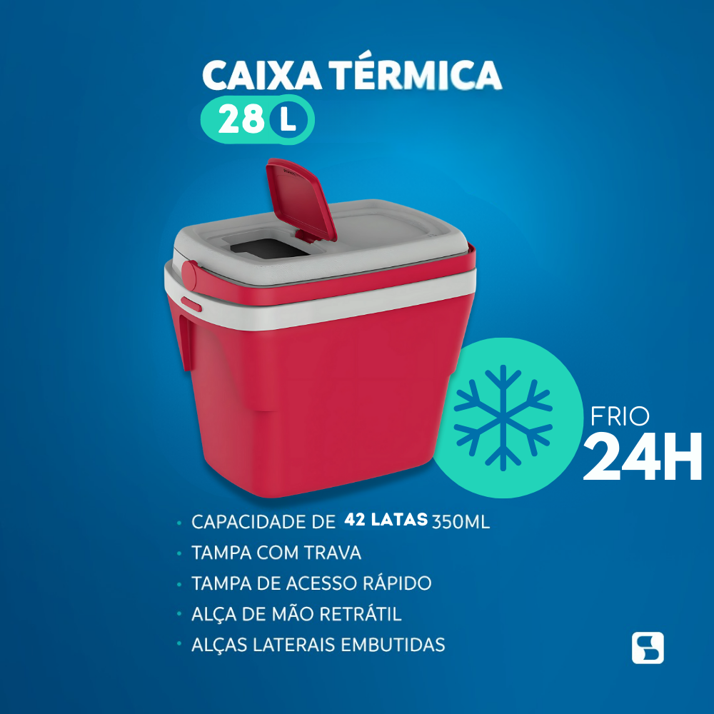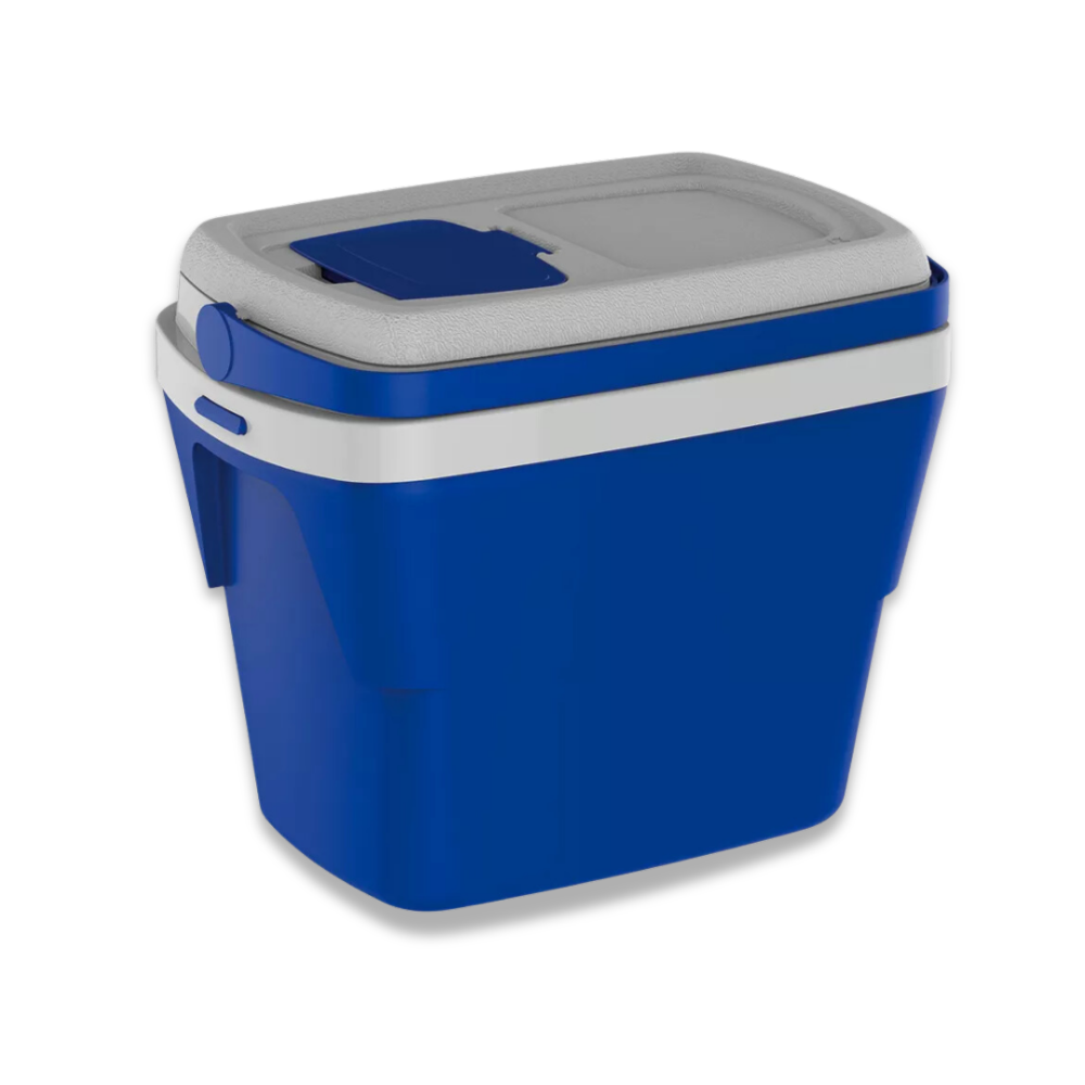 O Cooler de 28L é livre de BPA, possui tampa de acesso rápido e design diferenciado. Conta com alça retrátil, tampa que pode virar bandeja, alças laterais embutidas e isolamento em isopor (EPS). Pode ser empilhado para otimizar o espaço em até 35%. Ideal para armazenamento prático e eficiente.