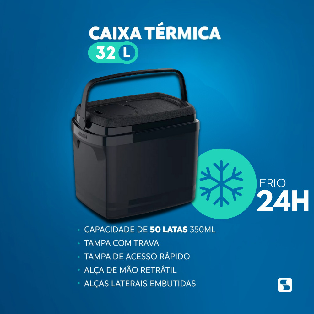 A Caixa Térmica 32L é ideal para manter bebidas e alimentos na temperatura ideal por mais tempo. Com design prático e resistente, conta com tampa vedada para melhor conservação térmica e alça reforçada para transporte seguro. Sua capacidade de 32 litros a torna perfeita para viagens, acampamentos, churrascos, pesca e uso diário. Fabricada com materiais duráveis, é leve e fácil de limpar, proporcionando praticidade e eficiência para qualquer ocasião.