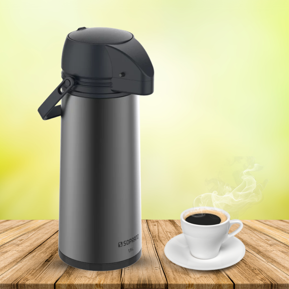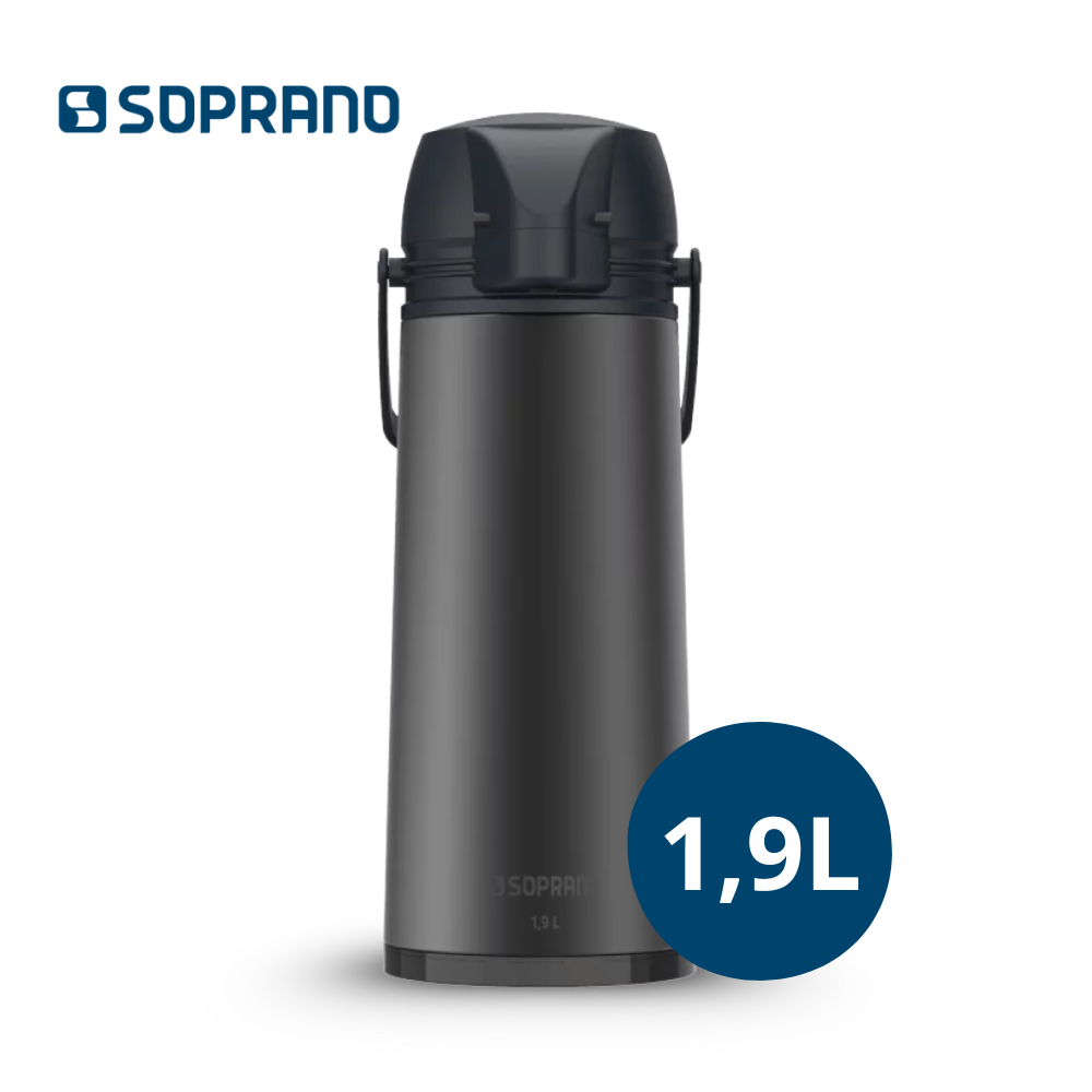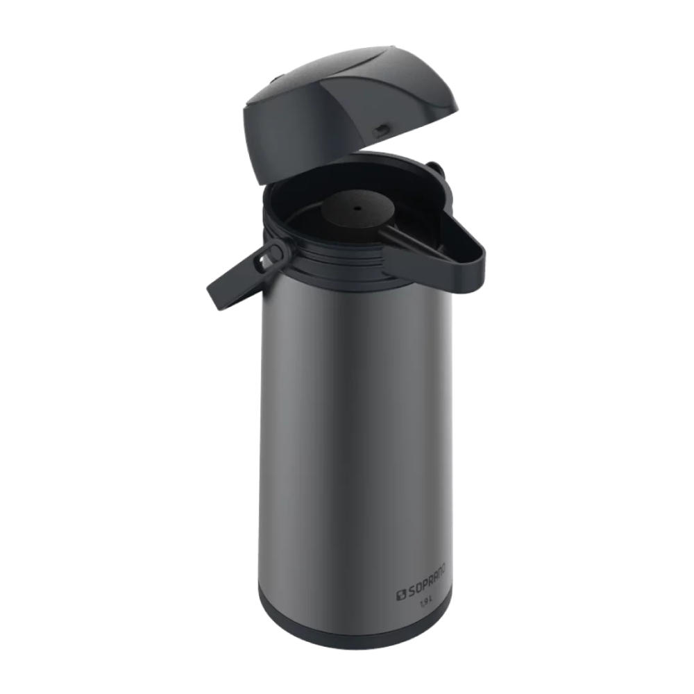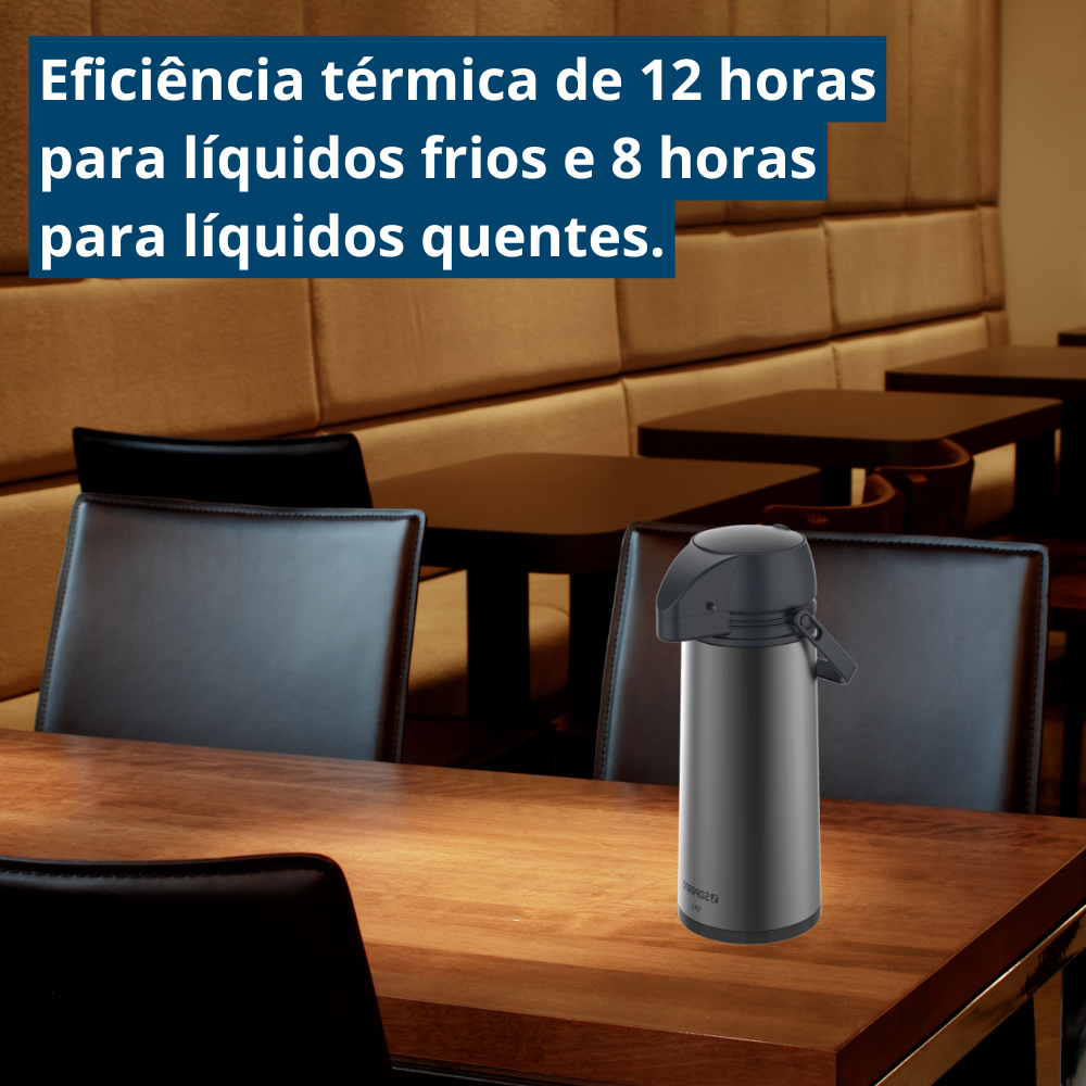 Ideal para grupos, sua versão de 1,9 L é perfeita para famílias e reuniões. Conta com bomba de pressão que facilita o uso até a última dose, alça ergonômica para transporte, tampa com trava segura e ampola de vidro, garantindo ótimo desempenho térmico com praticidade e segurança.