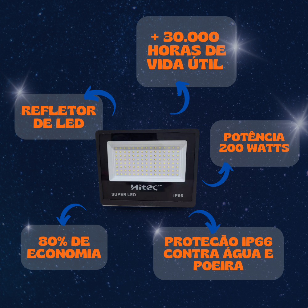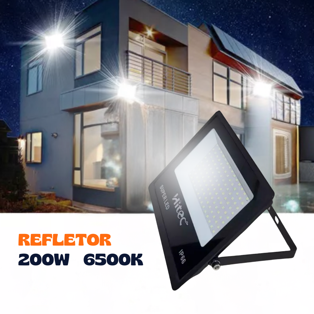 – Iluminação Intensa: Com 200W de potência e uma temperatura de cor de 6500K, o refletor proporciona uma iluminação potente e clara, ideal para grandes áreas que necessitam de alta visibilidade;