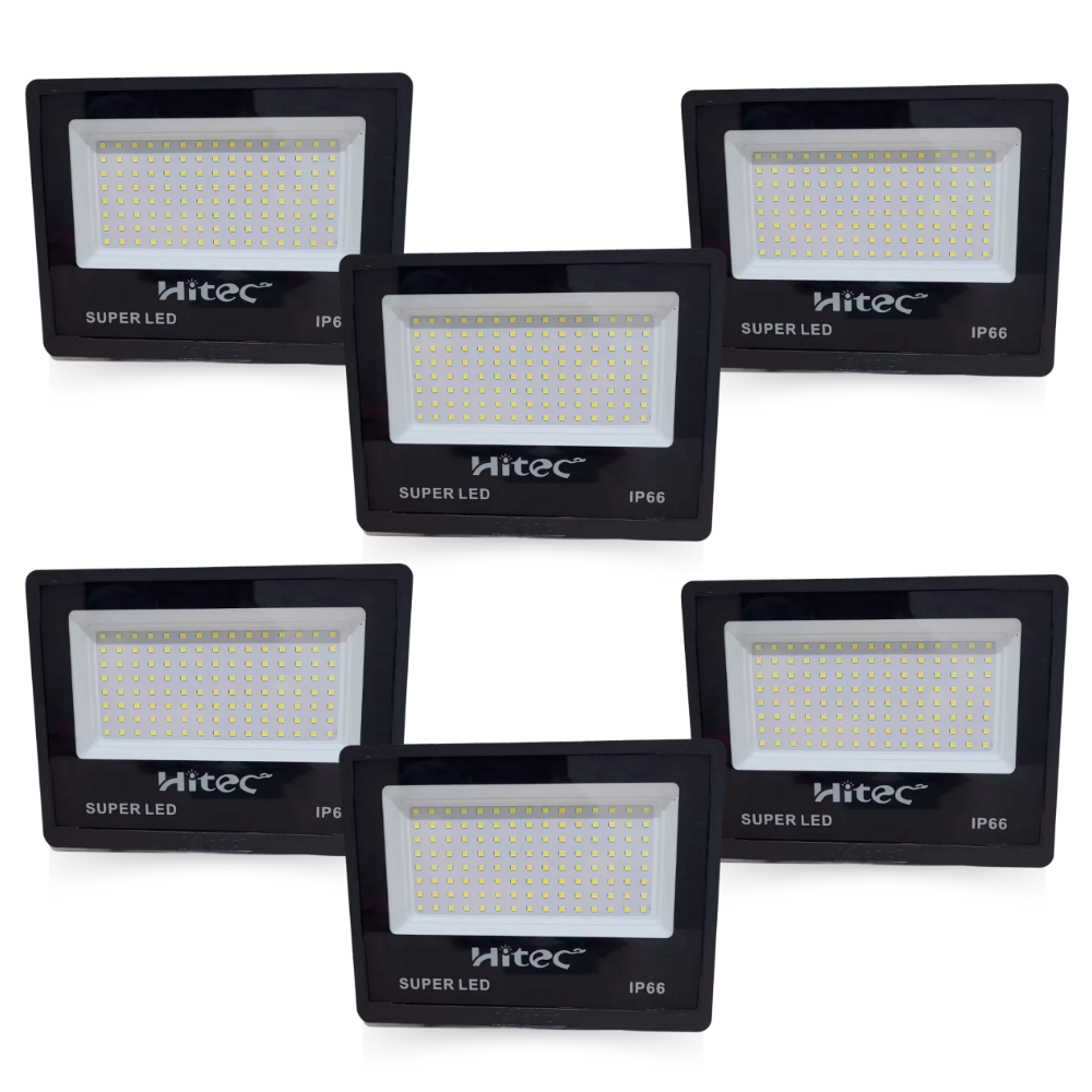 Kit Refletor De LED 200W 6500K HITEC 6 Unidades Preto Alta Potência Bivolt Design Resistente Iluminação Exterior Residenciais