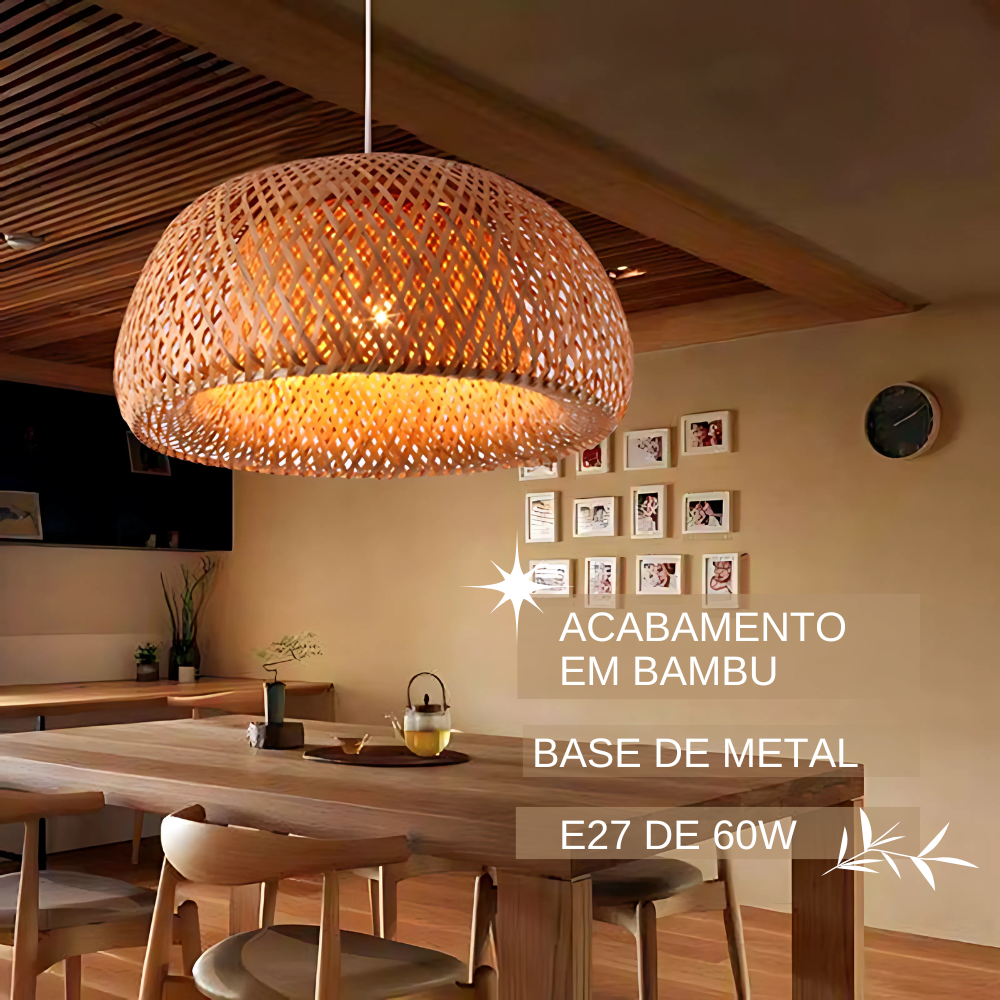 – Design Diferenciado: Feito em bambú, esse lustre completa a decoração da sua casa;
