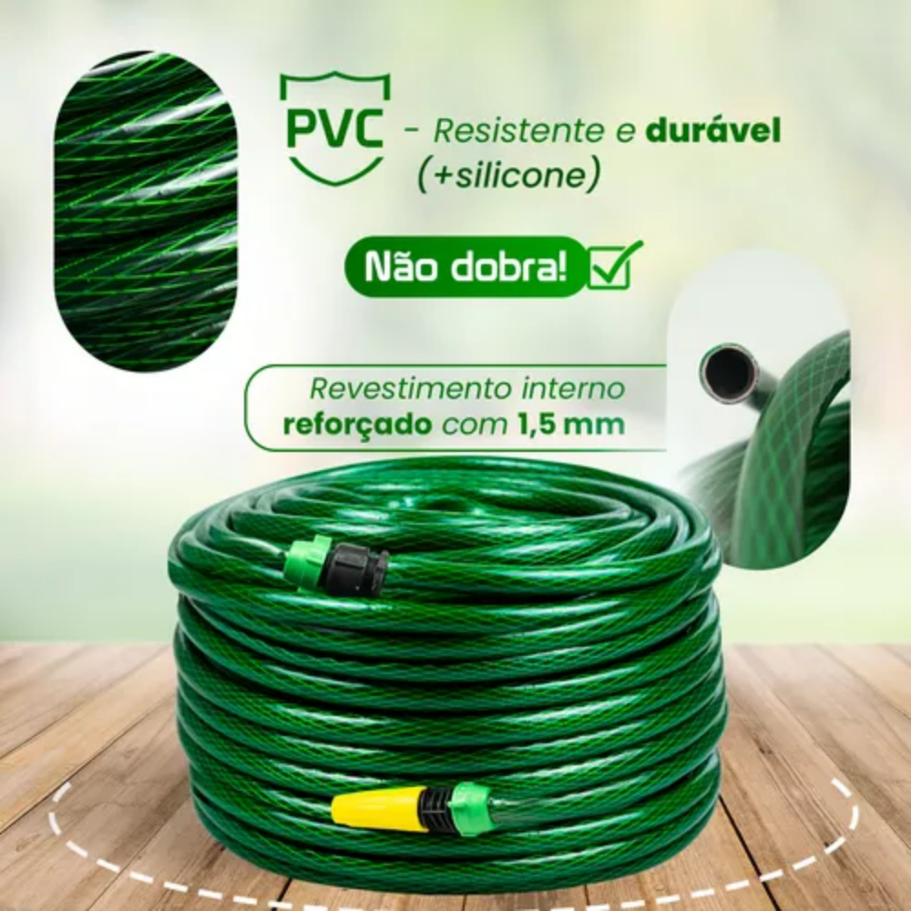 Feita de três camadas, sendo a camada interna de PVC, intermediária é em poliéster trançada e a externa também de PVC, esse produto é super resistente, garantindo a passagem de água sem vazamentos, ótima opção para você que já cansou de gastar com mangueiras que não duram.
