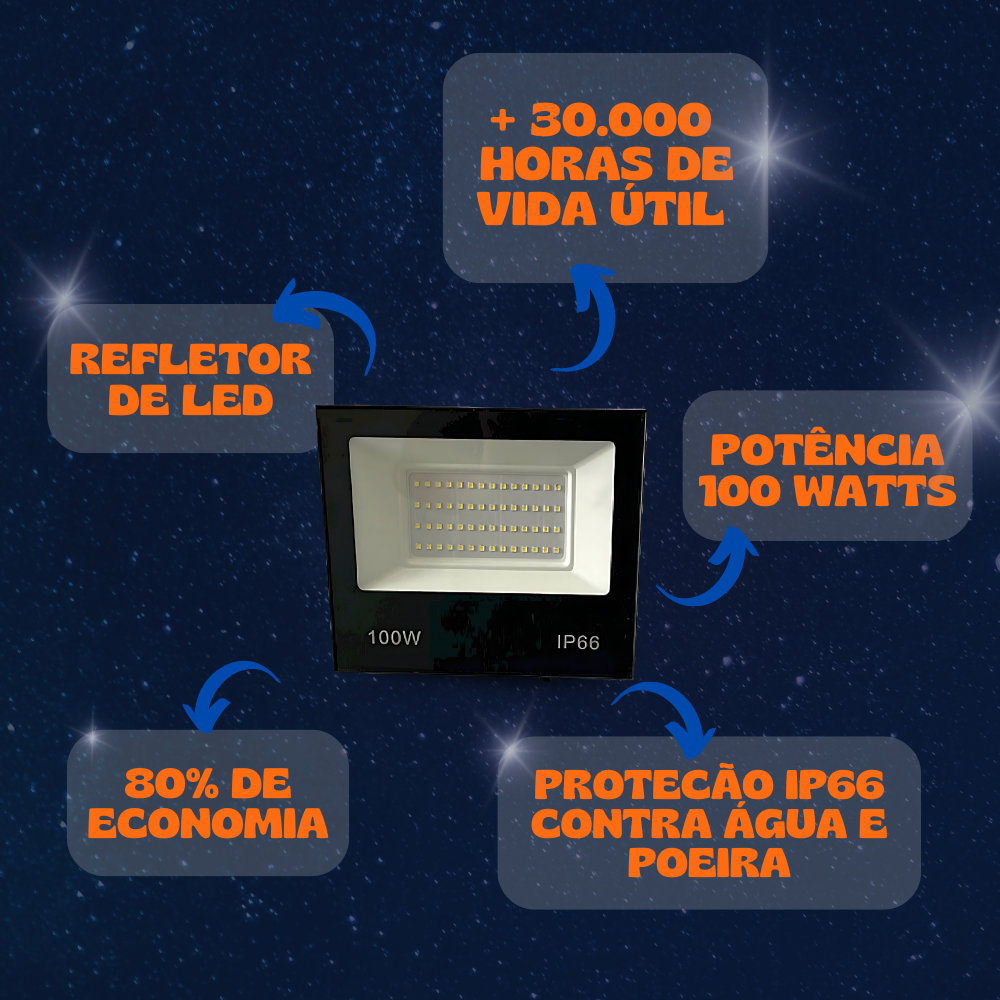 – Economia de Energia: A tecnologia LED de alta eficiência oferece uma iluminação brilhante com baixo consumo de energia, reduzindo os custos com eletricidade em comparação com refletores tradicionais;
