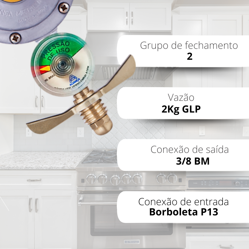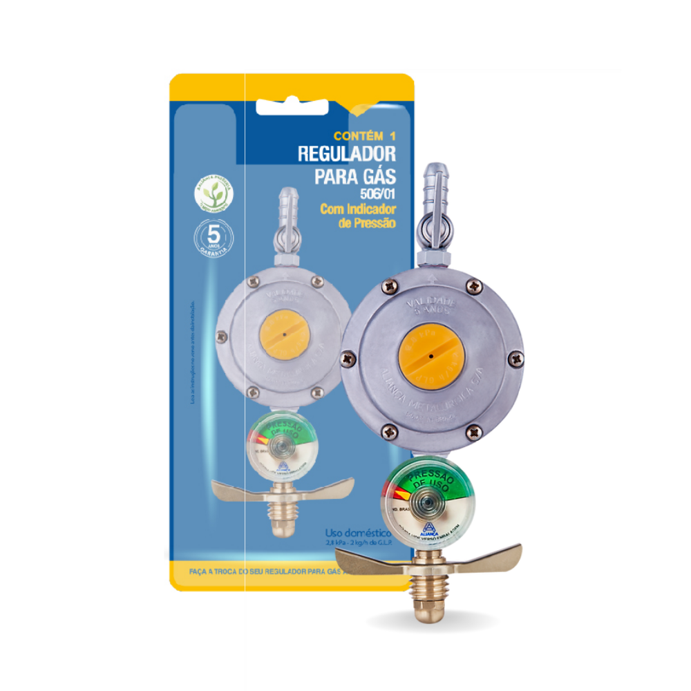 Registro Regulador de Gás De Cozinha Doméstico Blister 506/01 B-BTM Aliança Com Manômetro Pressão 2,8Kg Botijão GLP/13kg Cozinha